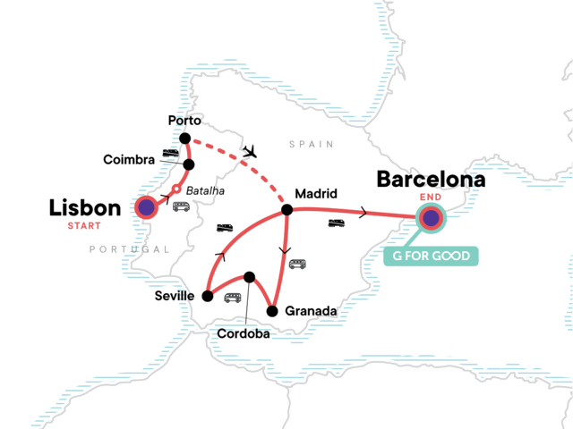 Your Hands-On Moment: Port Wine Cellar Visit, Porto. Orientation walks in Lisbon, Granada and Barcelona. Batalha gothic monastery entrance and visit. Porto orientation walk. Albaicin quarter visit. Alhambra guided tour. Mezquita Mosque and Jewish quarter visit in Cordoba. Flamenco show performance. Internal flight (Porto to Madrid). All transport between destinations and to/from included activities.