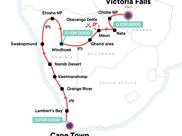 Your Discover Moment: Swakopmund. Fish River Canyon entrance. Sossusvlei Dunes and Sesriem Canyon entrance. Wine tasting in Lambert's Bay. Etosha National Park entrance and wildlife safari drives in our vehicle. San/Bushmen walk. Traditional dinner. Okavango Delta overnight bush camping excursion. All transport between destinations and to/from included activities.
