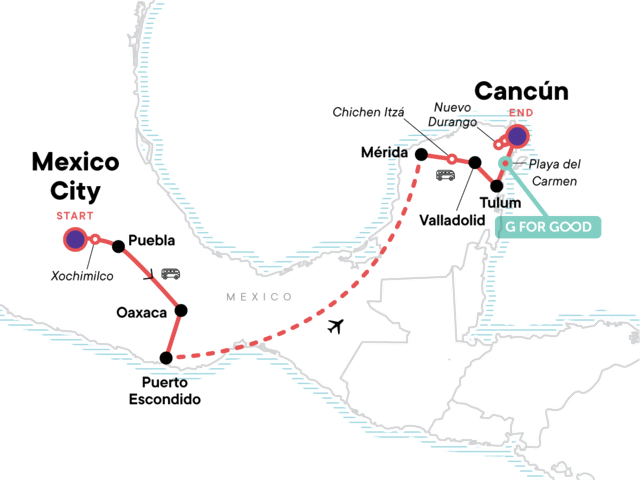 Your Foodie Moment: Yucatecan Community Lunch Experience and Cenote Swim, Cancún. Insiders tour of Mexico City with included street food lunch. Boat ride along the ancient canals of Xochimilco. Typical food experience meal in Oaxaca with tequila and mezcal tastings. CEO-led orientation walk in Puerto Escondido. Beach time at Puerto Escondido. Excursion from Mérida to cycle between and swim in cenotes. Guided tour of Chichen Itzá and Tulum ruins. Dinner inside a cenote near Valladolid. Beach time at Tulum and Cancún. Visit to an insect museum. All transport between destinations and to/from included activities.