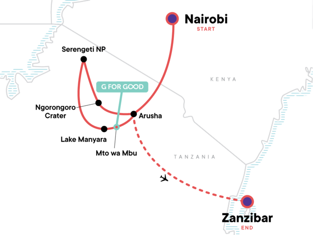 Your Welcome Moment: Welcome Moment - Meet Your CEO and Group. Lake Manyara wildlife safari drive. Serengeti wildlife safari drives. Ngorongoro Crater wildlife safari drive. Scenic flight from Arusha to Zanzibar. Orientation walk in Stone Town. Spice plantation guided tour. All transport between destinations and to/from included activities.