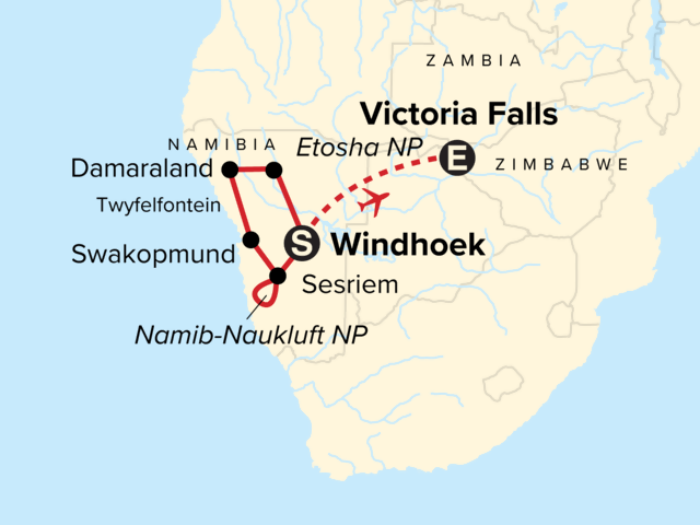 Your Journeys Highlight Moment: Zimbabwean Family Dinner, Victoria Falls. Arrival transfer. Sossusvlei desert excursion. Desert excursion with a local. View the Twyfelfontein ancient petroglyphs. Full-day open-vehicle wildlife safari drive in Etosha. Tour of Victoria Falls. All transport between destinations and to/from included activities.
