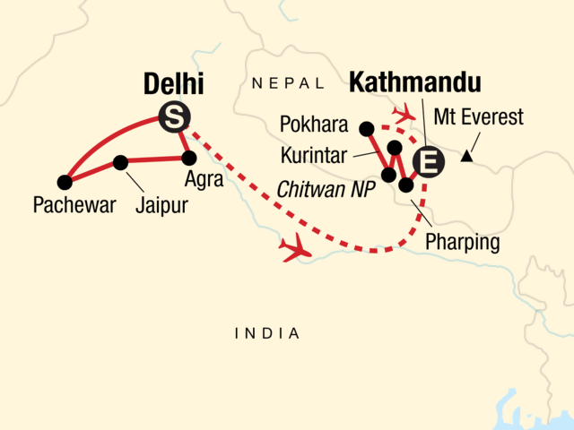 On this exciting South Asia journey, explore the three cities that form northern India’s famed “Golden Triangle”—Delhi, Agra, and Jaipur—and get a taste of mountain air and Buddhist culture in Nepal. Take in the ethereal beauty of the Taj Mahal and delve into the vibrant bazaars of rose-hued Jaipur. Then head to the Himalaya to discover ornately carved palaces and Buddhist monasteries, learn how to cook Nepalese dumplings with locals, and search for tigers and elephants in Chitwan National Park.