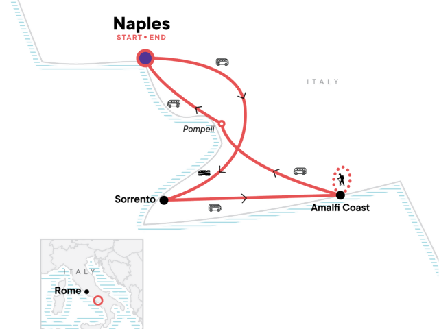 Taste limoncello in Sorrento, hike the "Path of the Gods" on the Amalfi Coast, soak in the views of coastal villages, take a guided tour of Pompeii at the foot of Mt Vesuvius, eat fresh and delicious regional food.