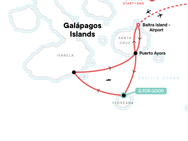 Your G for Good Moment: Floreana Community Guesthouse, Floreana Island. Charles Darwin Research Centre visit (Santa Cruz Island). Visit to Las Grietas. Snorkelling at Loberia (Floreana Island). Flamingo Lagoon visit (Isabela Island). Sierra Negra volcano hike. Giant Tortoise Breeding Centre visit. Tortuga Bay hike (Santa Cruz Island). Isabela Municipal Tax. Internal flights. All transport between destinations and to/from included activities.