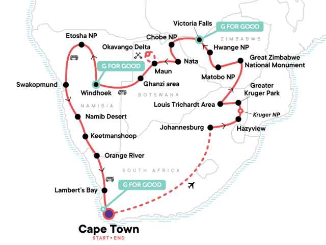 When you put the word “highlights” in the name of a trip, you better be confident that it lives up to the hype. This trip does. Across 30 epic days, you’ll go round-trip to Cape Town via Zimbabwe, Botswana, and Namibia — a new spin on one of our most popular routes — taking comfortable touring vehicles as well as staying in a mix of hotels and campsites for a well-rounded experience. Wildlife sightings and cultural moments come standard here — everything from searching for the "big five" in national parks to enjoying meals with local families. You’ve got memories made for a lifetime.