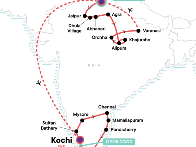 Your Local Living Moment: Kerala Backwaters Homestay, Alleppey. Old Delhi walk. Amber Fort tour. Rajasthani rural village stay. Dhula Village cycling excursion. Taj Mahal, Baby Taj and Agra Fort tour. Orchha Palace complex visit. Western Temple complex visit. Ganges River boat trips at sunrise and sunset, including candle flower ceremony. Fort Kochi orientation walk. Wayanad Tea Plantation and Factory visit. Chaumundi Temple and Mysore Palace visit. Mamallapuram Shore Temple visit. Pondicherry orientation walk. Madurai cycle-rickshaw ride and Sri Meenakshi temple visit. Cardamom Hills spice plantation tour. Internal flights. All transport between destinations and to/from included activities.