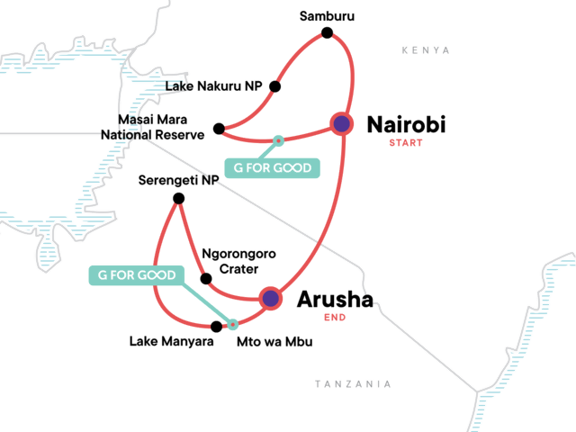 Please note that this tour is a combination of two G Adventures tours in two different countries. Due to local regulations, your local staff (driver/guide, cook) and vehicles will change halfway through the trip, and your group CEO and fellow passengers may also change between the Kenyan and Tanzanian sections of the trip.