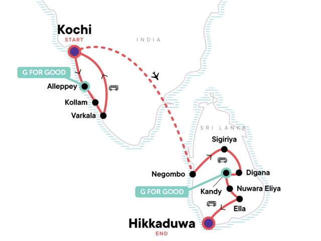 Your Big Night Out Moment: Hikkaduwa Beach Bar, Hikkaduwa. Guided Kerala boat tour and homestay. Morning ferry cruise on Kollam's backwaters. Neendakara Fishing Harbour visit. Orientation walks in Kochi, and Kollam. Internal flights. Sri Lankan lunch at a local village. Spice garden visit. Tea plantation tour. Little Adam's Peak Tour. Galle Fort tour. All transport between destinations and to/from included activities.