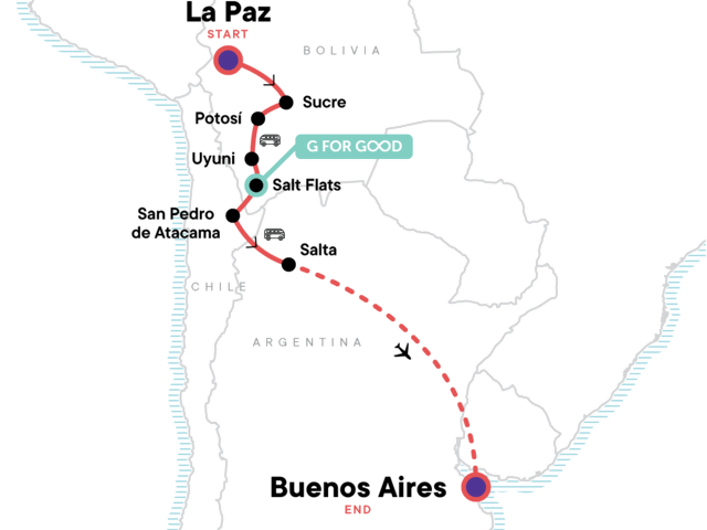Breathe in the high mountain air of La Paz and dance in the tango palaces of Buenos Aires on this two-week adventure. Connecting the Andes to the Atlantic, you'll journey across the surreal landscapes of the Atacama Desert and the Salar de Uyuni. Feel like a sophisticate as you sip wine in Buenos Aires and pull back the curtain on the centre of the continent. Best of all, you'll do it in the company of other fun, young travellers. Don't choose between inspiring wilderness and urban sophistication — do it all.