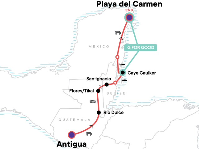 Your Discover Moment: Playa del Carmen. Scenic boat ride to Livingston. Tikal guided tour. Free time in San Ignacio, Caye Caulker, and Playa del Carmen. All transport between destinations and to/from included activities.