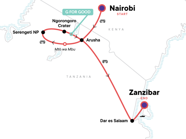 Your First Night Out Moment: Connect With New Friends. Transfer from Nairobi to Arusha. Entrances and wildlife safari drives in Serengeti National Park and in Ngorongoro Crater. Ferry to Zanzibar. Stone Town orientation walk. Beach time in Zanzibar. All transport between destinations and to/from included activities.