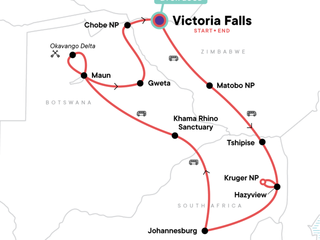 Your First Night Out Moment: Connect With New Friends. Guided rhino walk and open vehicle safari drive in Matobo NP. Kruger NP entrance with wildlife safari drives in our overland vehicle. Traditional dinner and local dancing. Khama Rhino Sanctuary Drive. Okavango Delta overnight bush camping excursion. All transport between destinations and to/from included activities.