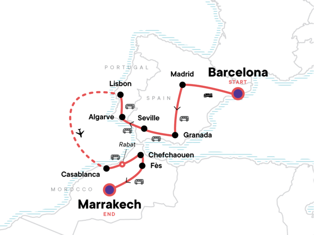 Your Big Night Out Moment: Lisbon. Tapas bar crawl (Granada). Orientation walks in Barcelona, Madrid, Granada, Seville and Lisbon. Enjoy free time in Rabat. Explore the blue city of Chefchaouen. Visit the medina and souks of Fès. Discover the bustling city of Marrakech. All transport between destinations and to/from included activities.