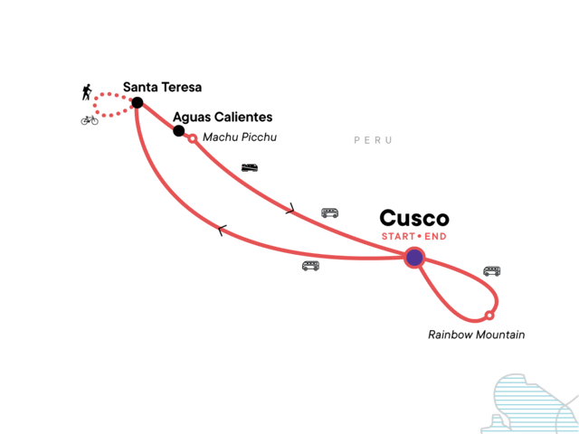Your First Night Out Moment: Connect With New Friends. Mountain Biking (Malaga High Pass). Santa Teresa hike. Ziplining. Train to Aguas Calientes. Guided tour of Machu Picchu. Rainbow Mountain hike. All transport between destinations and to/from included activities.