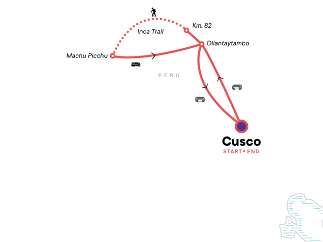 Hotel night in Cusco. Inca Trail guided hike with cooks and porters (4 days). Included foam sleeping mat and duffel for porters to carry personal items on the trek. Guided tour of Machu Picchu. All transport between destinations and to/from included activities.