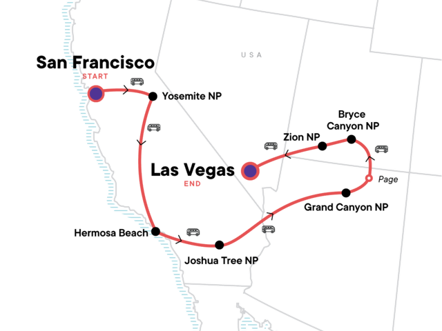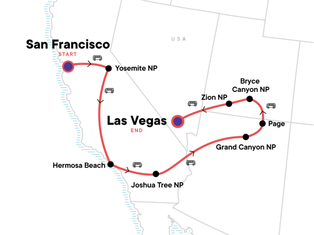 Your Welcome Moment: Welcome Moment - Meet Your CEO and Group. Yosemite National Park visit and hikes. Surf lesson in southern California. Visit to Joshua Tree National Park. Drive along Route 66. Grand Canyon sunset pizza dinner. Hike in Grand Canyon National Park. Visit to Horseshoe Bend. Bryce Canyon National Park visit. Zion Glamping. Zion National Park visit. Entrance fees to all national parks and monuments with hiking and walking excursions. Self-inflating mattresses and dome tents. All transport between destinations and to/from included activities.
