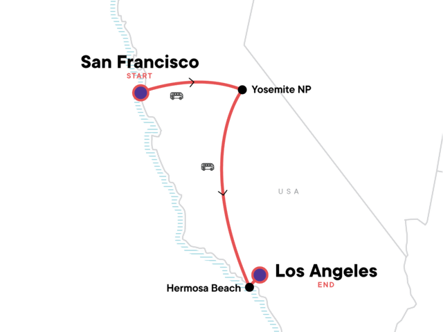 Enjoy the many wonders of Yosemite National Park, Get sprayed by the waters of Nevada and Vernal Fall, Hike the amazing Tuolumne Grove of Giant Sequoias, Catch a few waves with a surf lesson, Spend some time relaxing in the sand of a hip southern California town.
