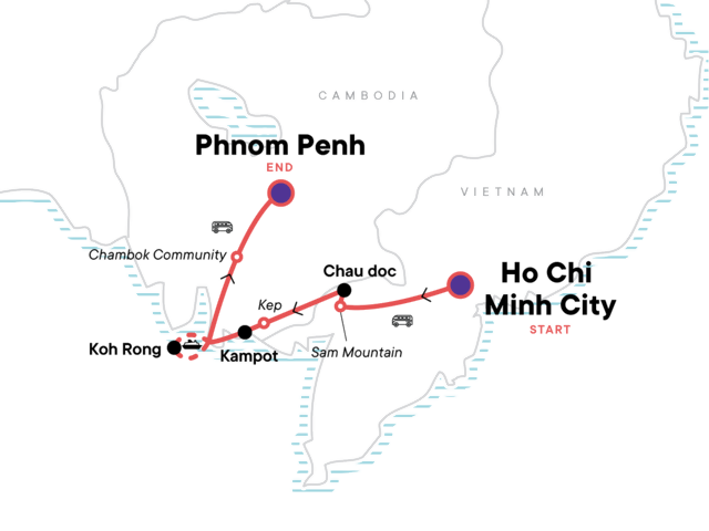Sample street food in bustling Ho Chi Minh City, Explore Sam mountain and Hang cave Pagoda by motorbike, Slurp noodle soup from a floating vendor, Snap selfies at the moss-covered ruins in Monivong Bokor NP, Bake on the whitesand beaches of Koh Rong island