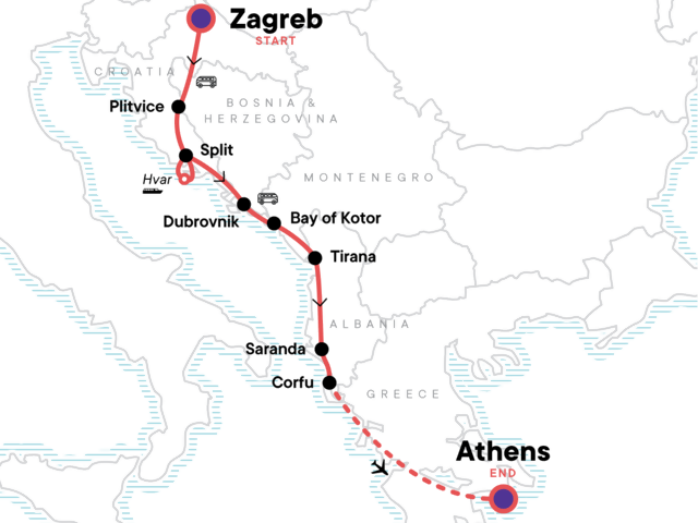 Your Big Night Out Moment: Athens. Orientation walk in Zagreb, Tirana, and Corfu. Entrance to Plitvice Lakes National Park. Day trip to Hvar. Guided tour of Diocletian's Palace (Split). Evening orientation walk in Split. Internal flight. All transport between destinations and to/from included activities.